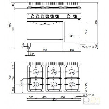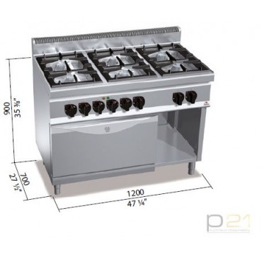 Kuchnia HIGH POWER, gazowa, 6-palnikowa z piekarnikiem elektrycznym GN2/1 31,5 kW + 7,5 kW/400V, G7F6+FE, Berto's